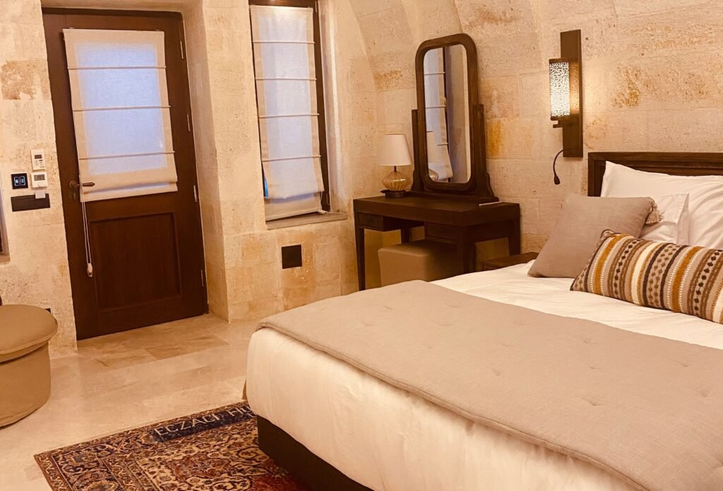 Imagine the world growing quiet as you watch colorful hot air balloons drift across the dawn sky, a warm morning tea in your hands. Picture the soft glow of firelight and the gentle crackle of a fireplace setting the tone for conversations that linger long after the night has settled. Within the ancient embrace of Cappadocian stone, sink into a private pool or jacuzzi where time doesn’t merely slow down, it serves you.